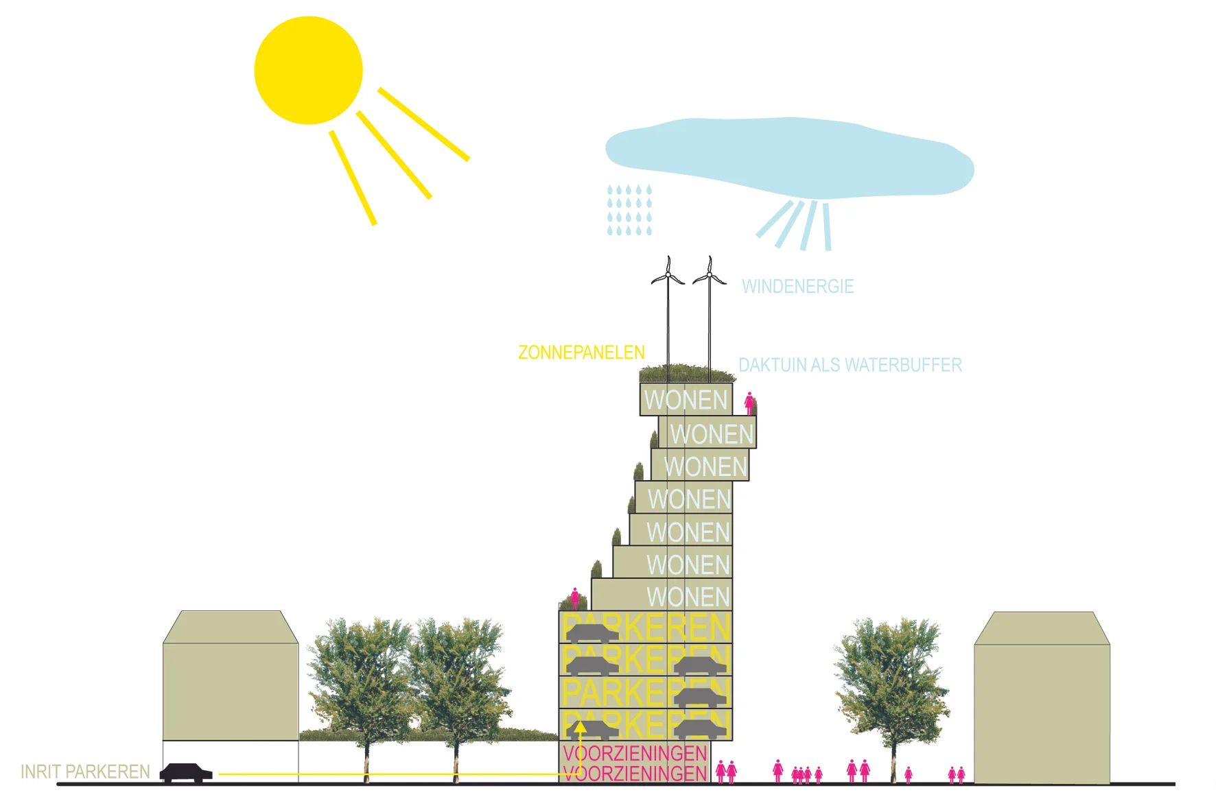Ons voorstel gaat niet alleen over het maken van mooie gebouwen, maar over het maken van aantrekkelijke buurten. We stellen voor in een buurt een autovrije straat te creëren en een kleinschalig gebouw toe te voegen. Dit gebouw bevat naast parkeerplaatsen ook voorzieningen en woningen. De autovrije straat veranderd automatisch in een plein: een prettige en betere leefomgeving voor jong en oud.